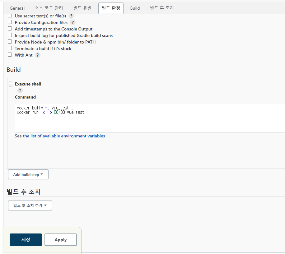 마지막으로 빌드 환경에서 쉘 스크립트 실행을 선택한다.