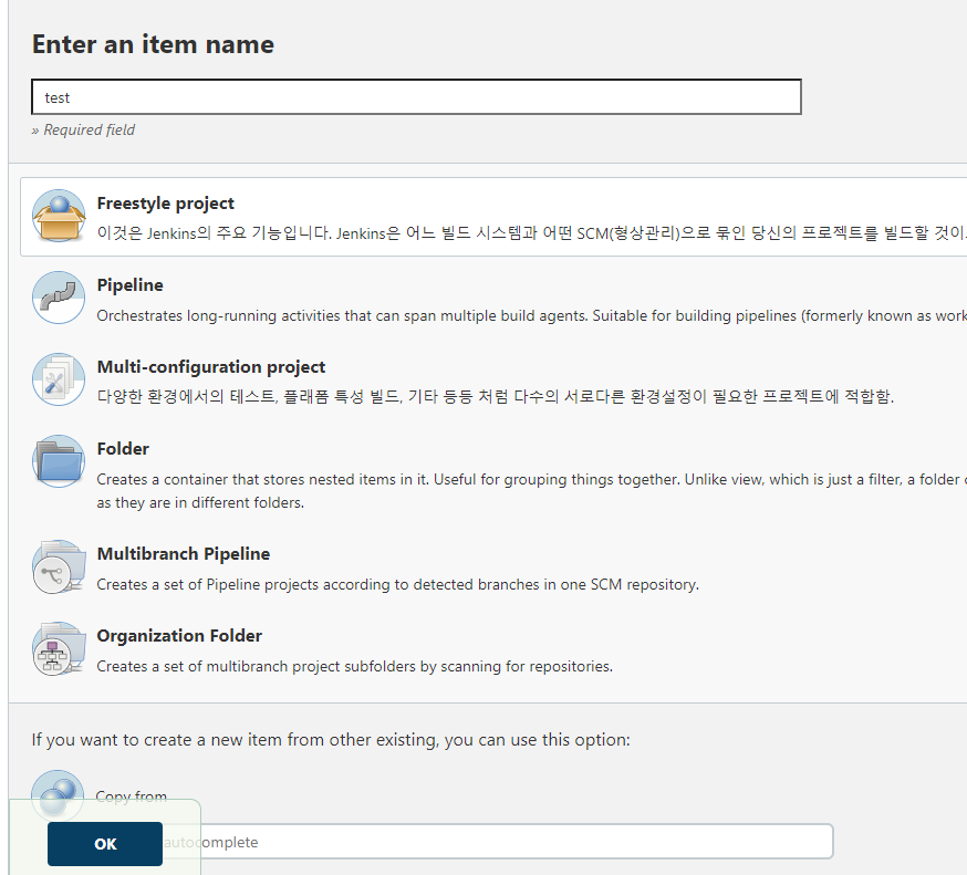 Dashboard > 새로운 Item을 클릭해서 새로운 프로젝트를 만든다. 프로젝트 이름을 입력한 후, Freestyle project를 선택한다.