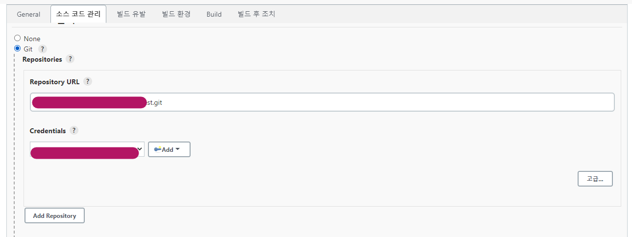 소스 코드 관리 > Git을 선택하고 git clone 주소를 입력한다.