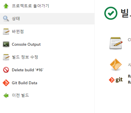 Console Output 메뉴에서 초록색 동그라미 체크 아이콘이 나오면 정상 빌드가 완료된 것이다.