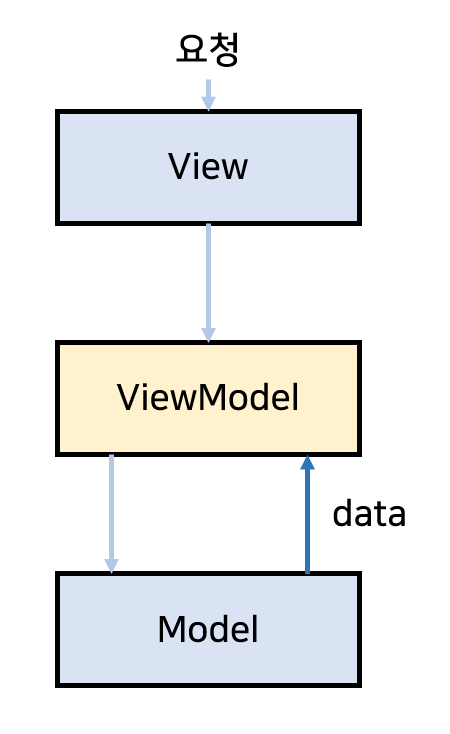 - ViewModel : Vue 역할. view와 model을 연결하고 자동으로 바인딩하므로 양방향 통신을 가능하게 한다.